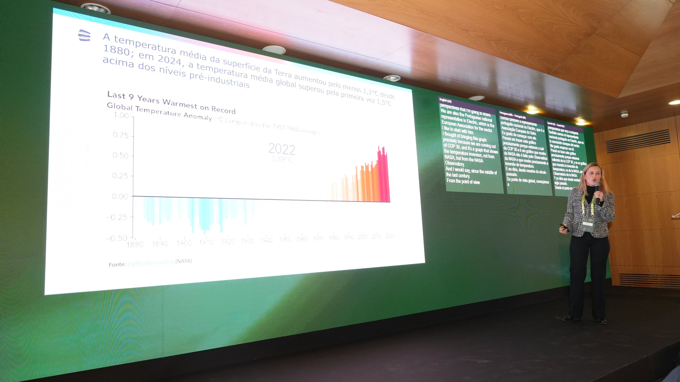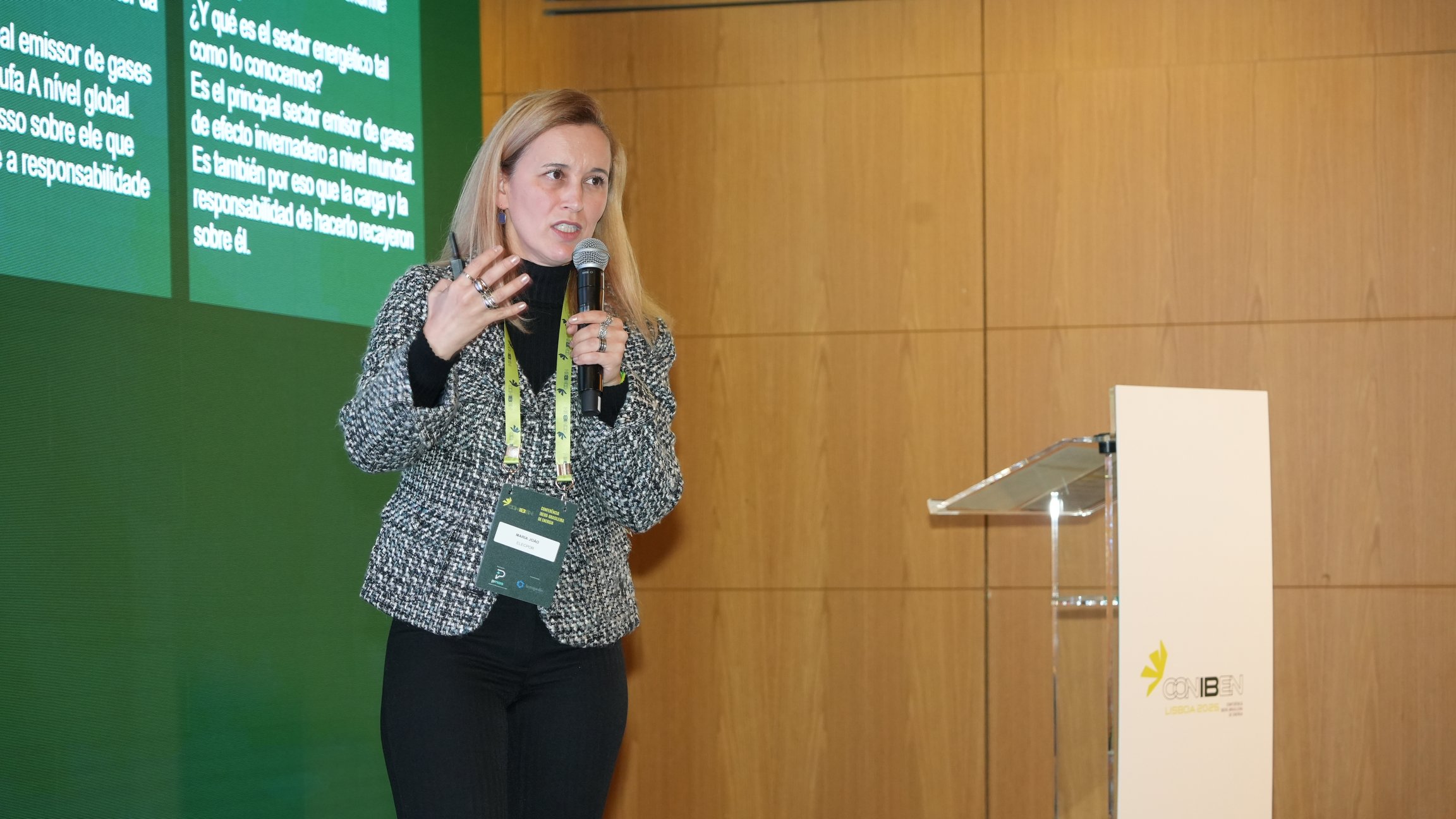 Maria João, representante da ELECOPOR, compartilhou a perspectiva de Portugal sobre o planejamento da transição energética na Europa e na Península Ibérica. Ela apresentou dados sobre o aumento da temperatura média global, que já ultrapassou 1,5 graus centígrados, e os desafios que isso representa para as políticas de descarbonização.