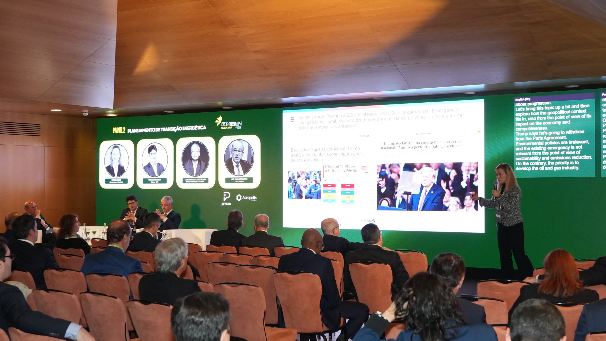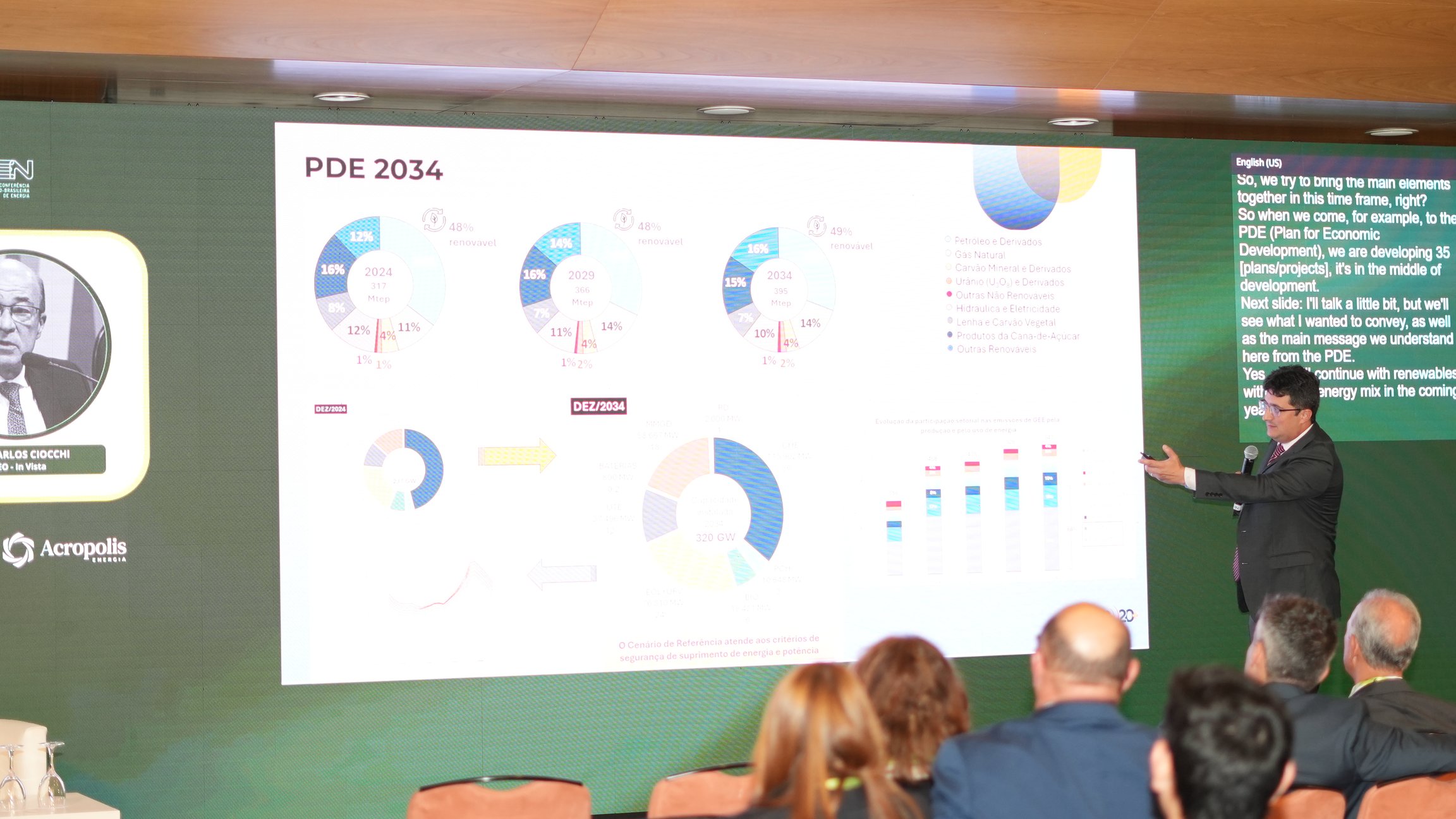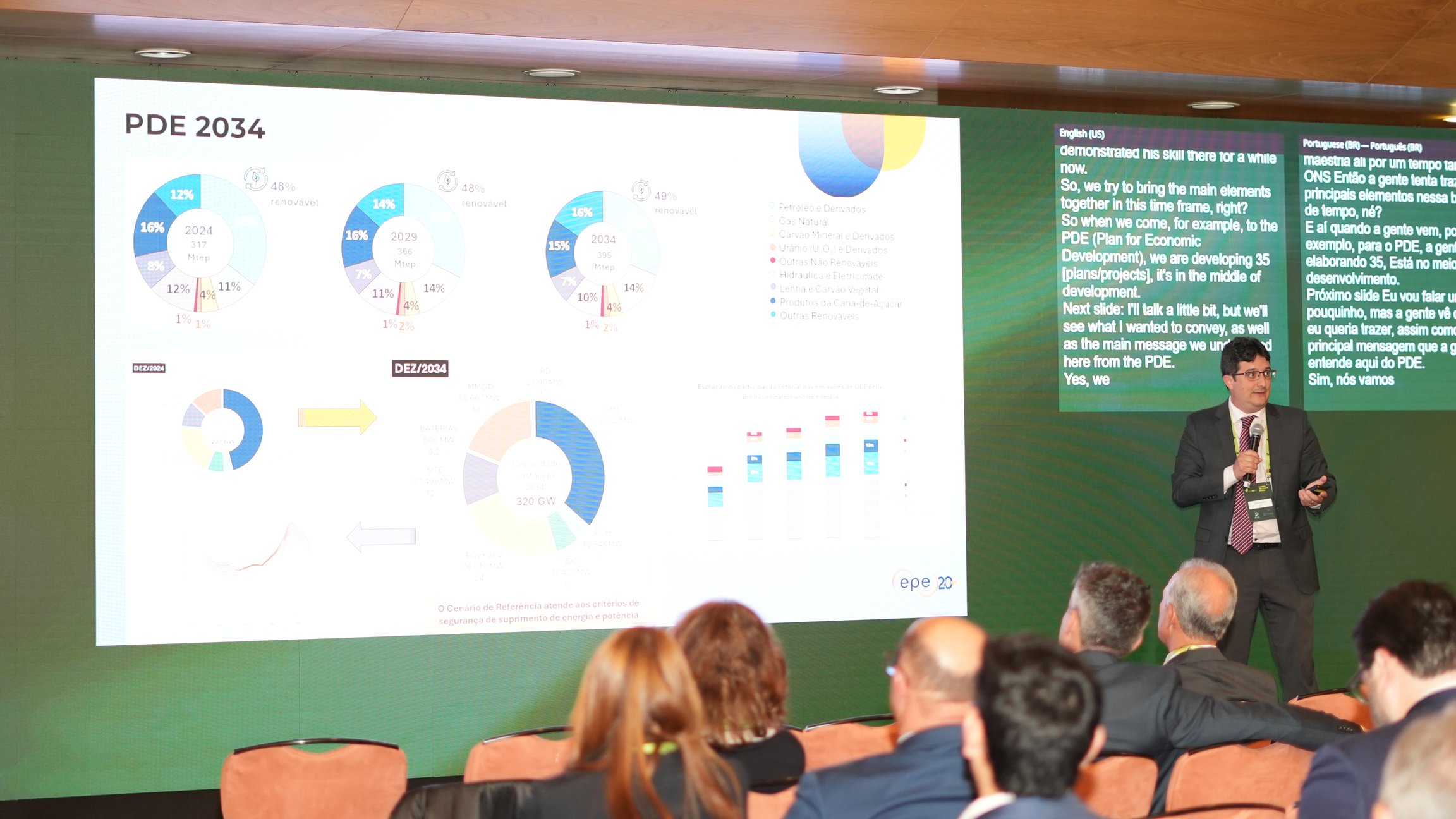 A apresentação abordou a matriz energética do Brasil, destacando que 50% dela é renovável, o que coloca o país à frente de outros do G20.