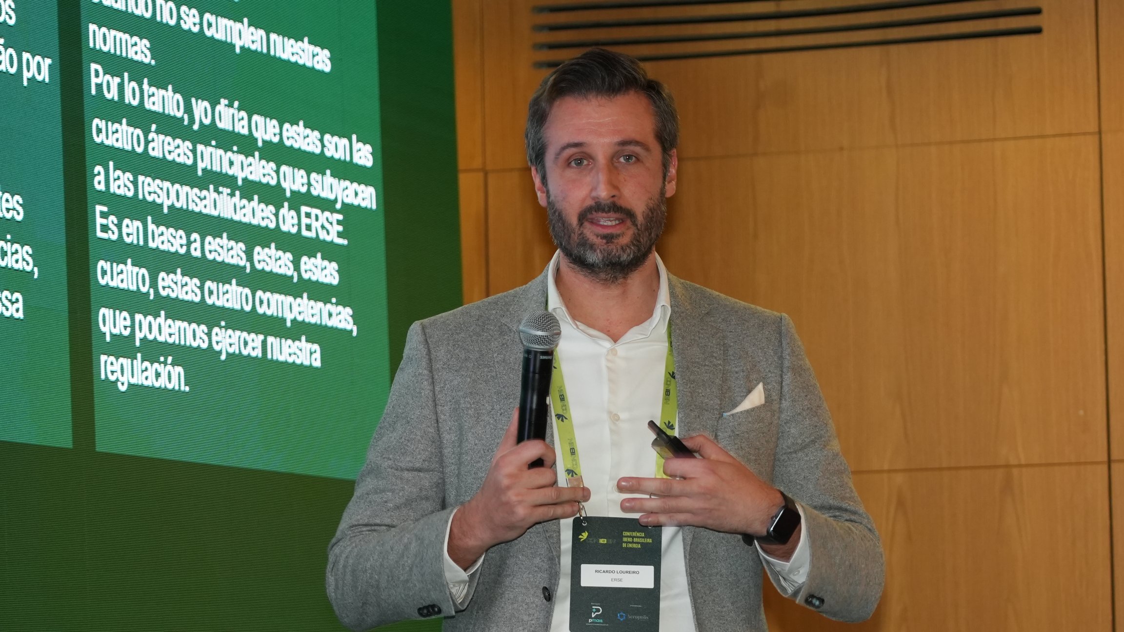 O orador, economista e representante da ERSE, apresentou a evolução da regulação em Portugal, destacando a criação da ERSE há 30 anos e suas competências, que incluem regulação, supervisão, consultoria e poderes sancionatórios.