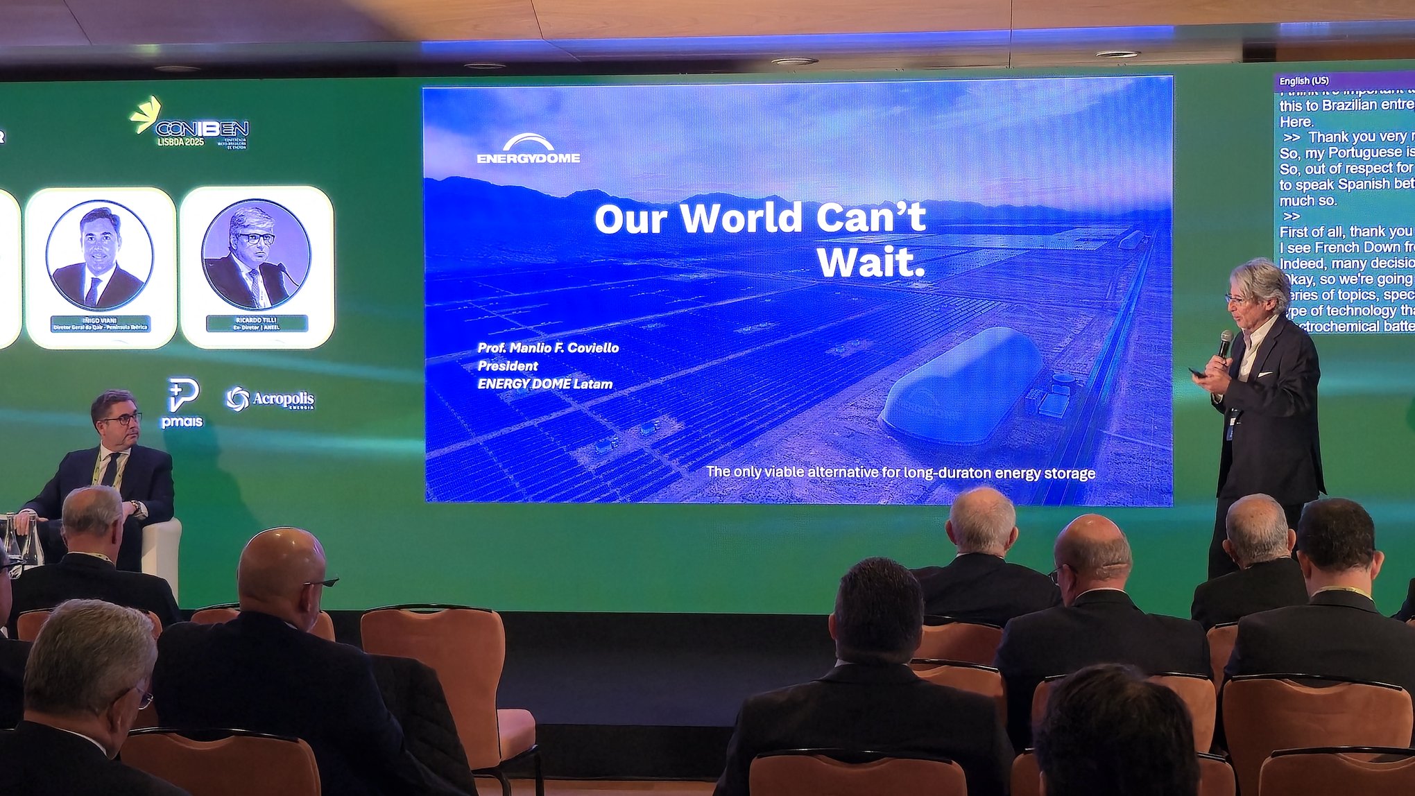 Também foram discutidos os preços voláteis do lítio e a necessidade de sistemas de armazenamento de longa duração (LDS). Foi apresentada a tecnologia da Energy Dome, que utiliza CO2 líquido para armazenamento, destacando sua eficiência e longa vida útil. Foram mencionados projetos em andamento na Itália, em Wisconsin, na Índia e em Omã, assim como a iniciativa regulatória na Itália chamada Maxe, que busca melhorar a capacidade de armazenamento.