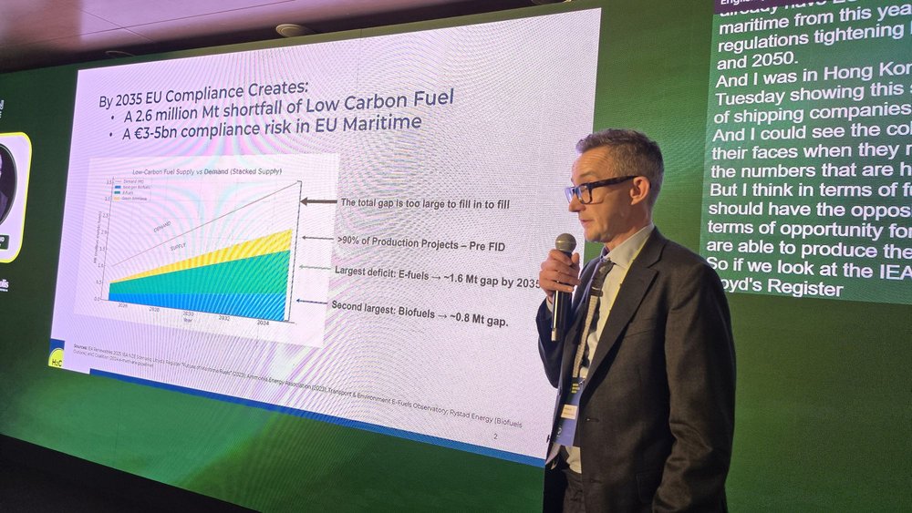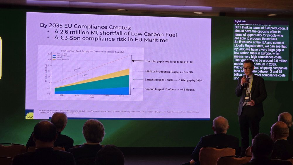 By 2035, there is an expected gap of 2.6 million metric tons per annum in low carbon fuels in Europe, leading to compliance costs of 3 to 5 billion euros per annum for shipping companies. Allen discussed compliance costs for biodiesel and LNG vessels, emphasizing the need for fuel switching to mitigate these costs. He noted the impact of various global regulations on shipping companies and the necessity for forward agreements to secure access to ultra-low carbon fuels.